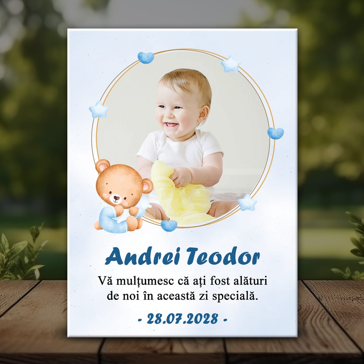 Magneți mărturii pentru botez băieți cu ursuleț. Mărturia poate fi personalizată cu poza bebelușului, data botezului, numele, dar și cu un mesaj de mulțumire pentru invitați.