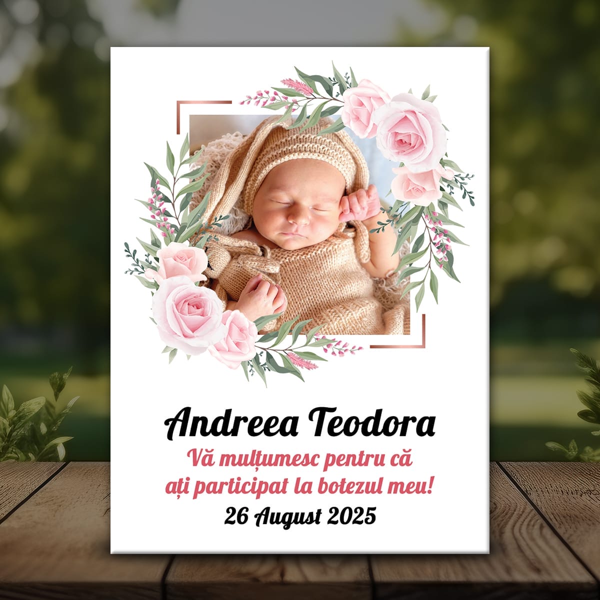 Mărturie de botez pentru fete cu mesaj de mulțumire, poză și dată.