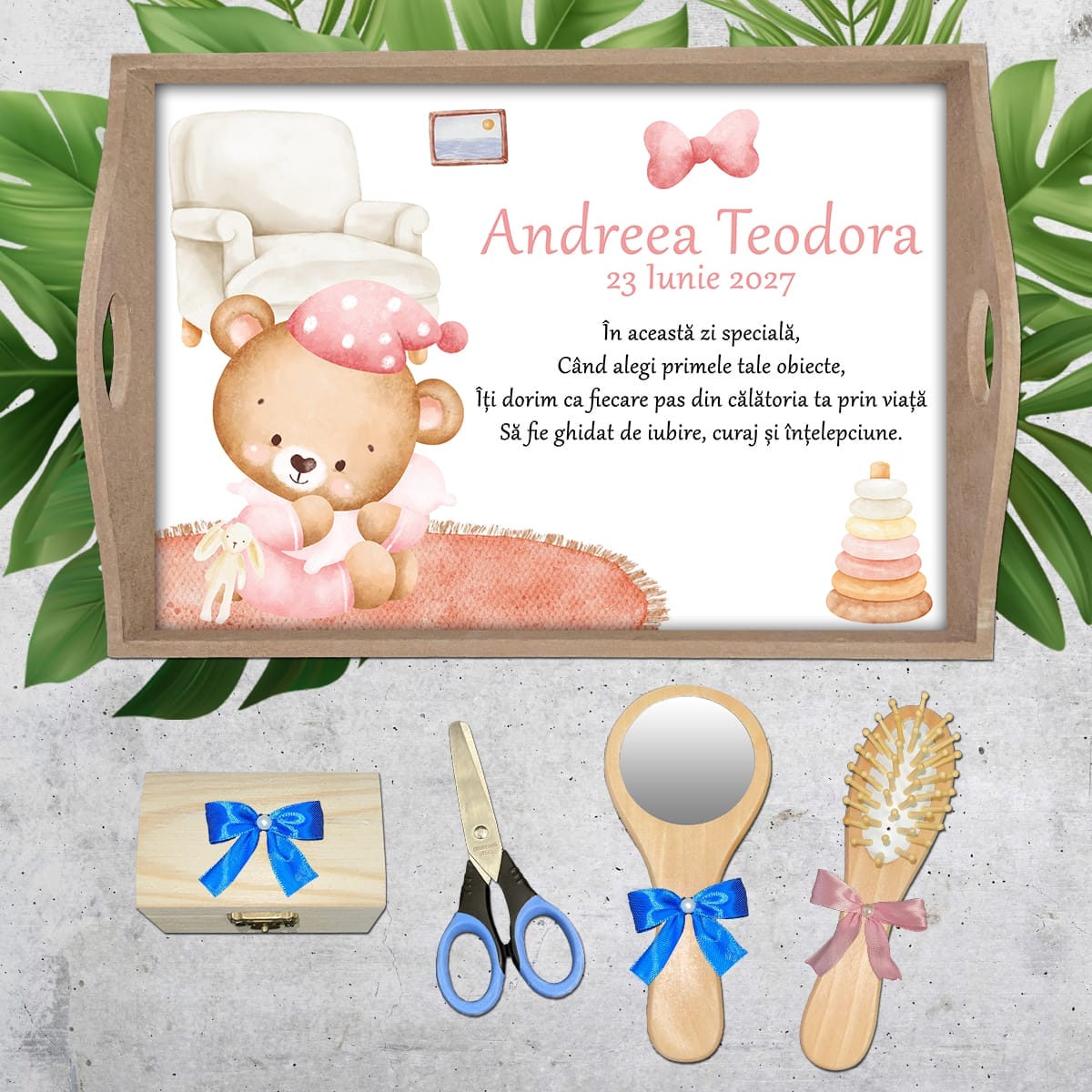 Comandă o tăviță moț complet personalizată după bunul plac. Tăvița poate fi cumpărată individual sau într-un set complet ce conține: tava pentru moț, perie, oglindă, forfecuță și cutiuță pentru moț.