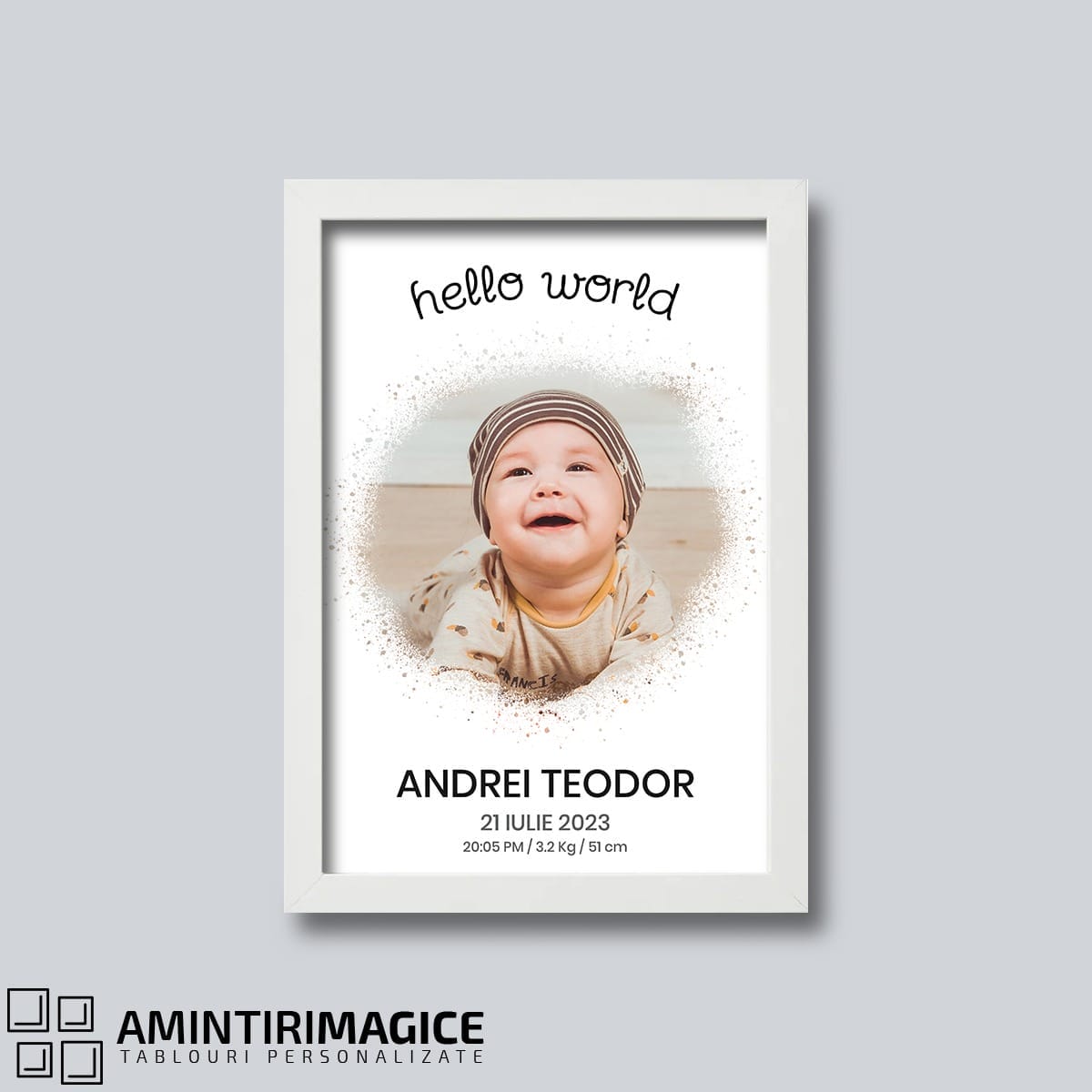 Hello World este un tablou personalizat pentru nou-născut ce conține toate detaliile legate de naștere.