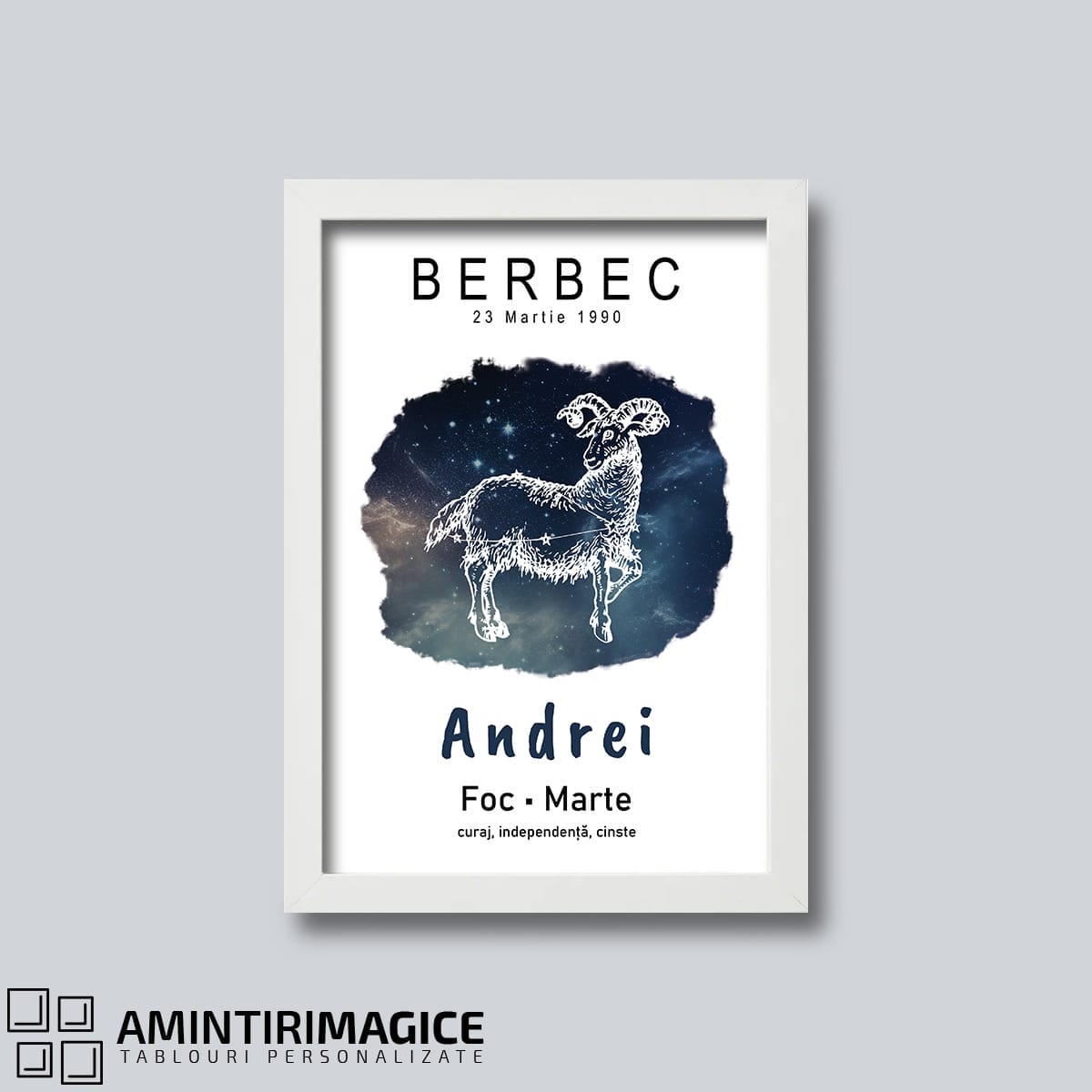 Adaugi textul dorit, dacă modelul ales îl permite, și selectezi detaliile de personalizare precum dimensiunea sau culoarea ramei.