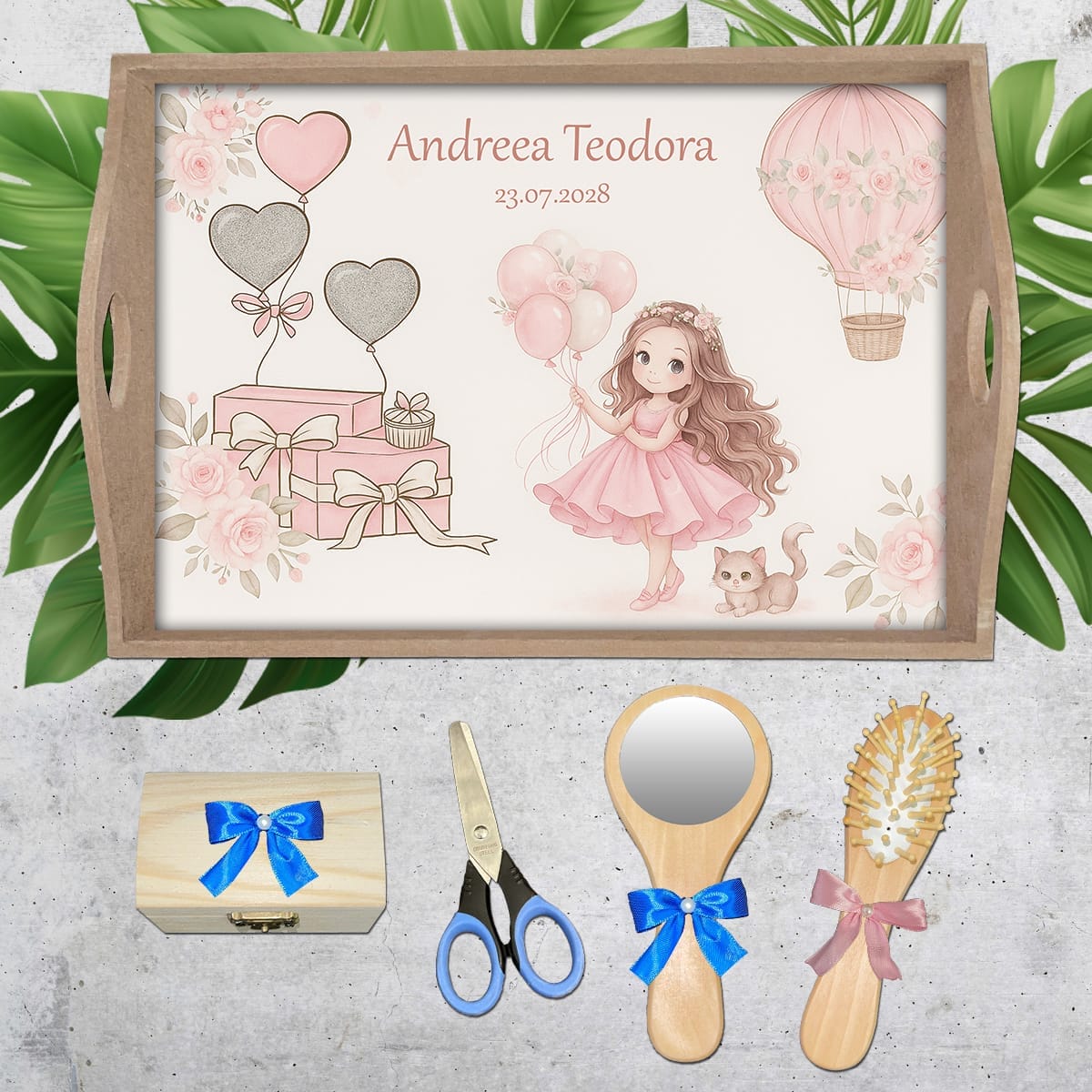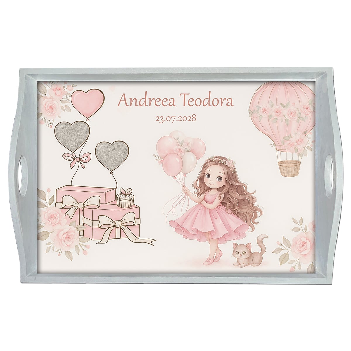 Tavă pentru moț fete personalizabilă cu nume și dată. Acest model conține desenul unei fetițe cu baloane, o pisicuță și multiple elemente roz.