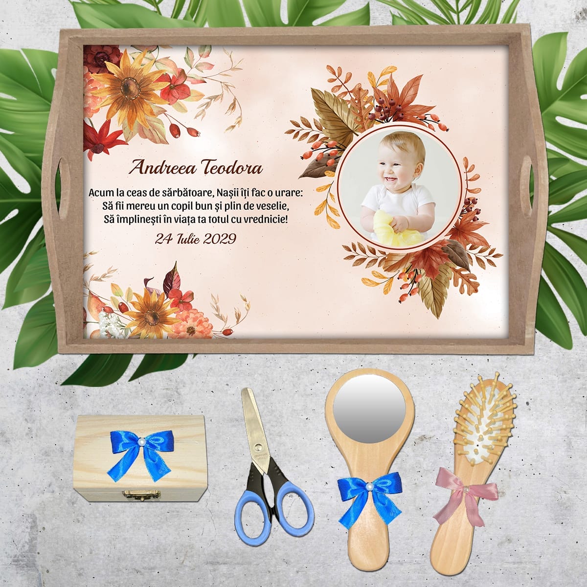Tavă sau set de moț personalizată cu nume, poză, dată și mesaj. Modelul conține elemente florale specifice anotimpului de toamnă.