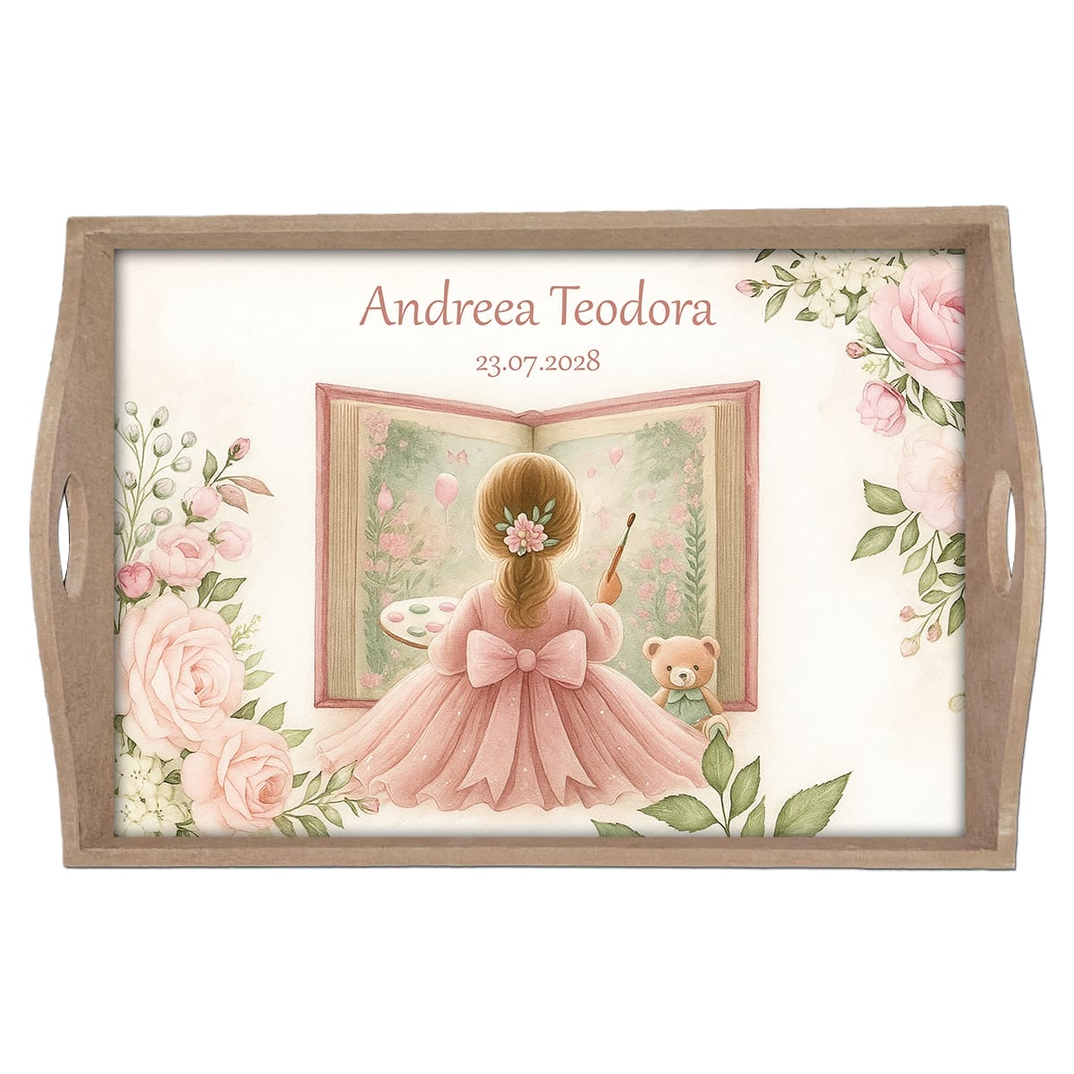 Tăviță moț personalizată pentru fetițe. Se poate cumpăra simplă sau vopsită, singură sau în set. Conține desenul unei fetițe care pictează într-o carte.