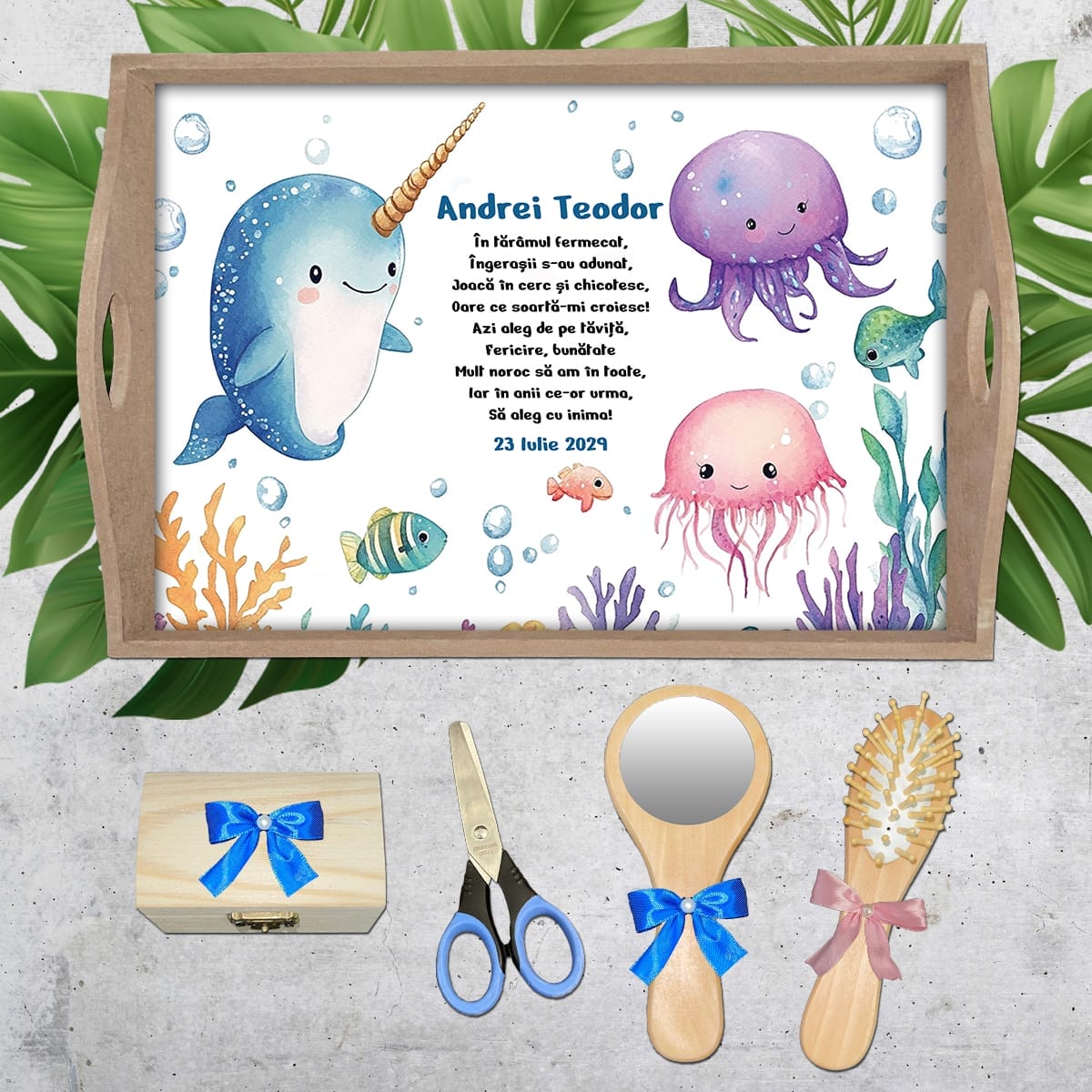 Tăviță moț personalizată cu nume, mesaj și dată. Acest model conține desenul unor animăluțe marine și are tematica oceanului.