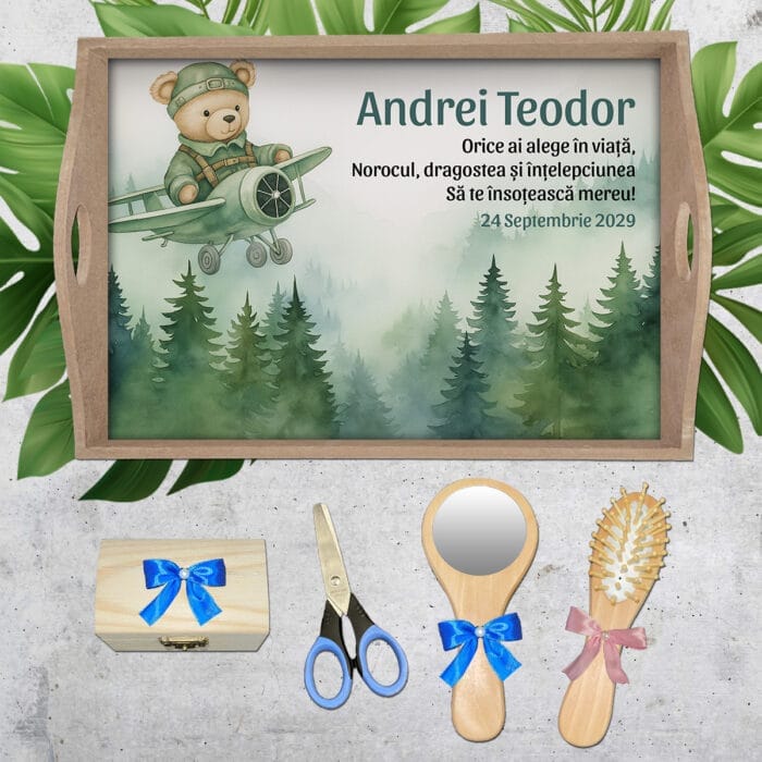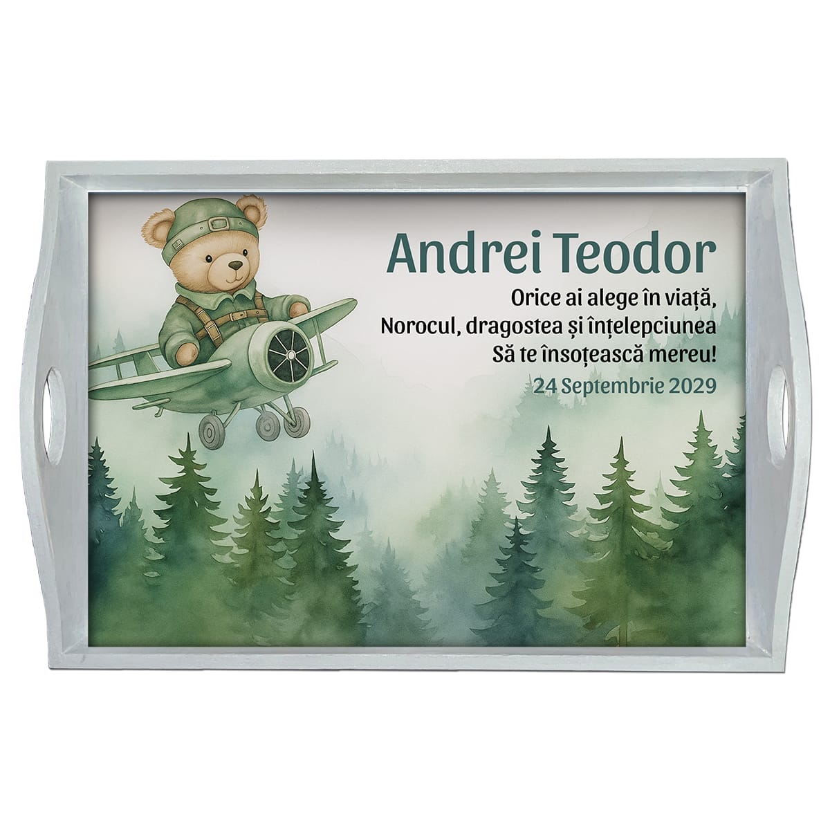 Tăviță moț personalizată pentru băieți cu un ursuleț într-un avion care zboară deasupra unei păduri.