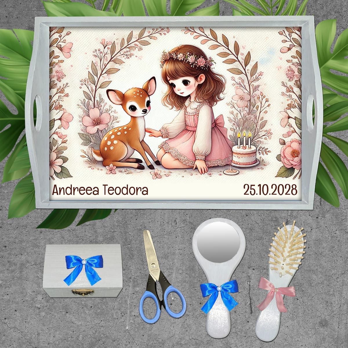Comandă o tăviță moț complet personalizată după bunul plac. Tăvița poate fi cumpărată individual sau într-un set complet ce conține: tava pentru moț, perie, oglindă, forfecuță și cutiuță pentru moț.